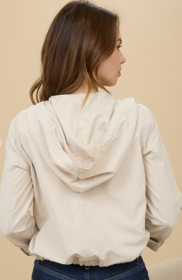 This hoodie has a zipper front closure with snap buttons, roll up sleeves with tab and front pockets.